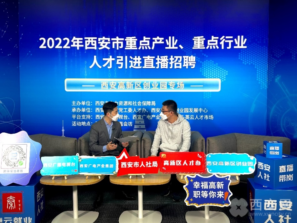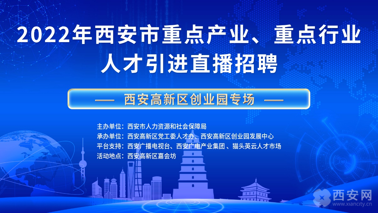 12月1号上午 10:00《2022年西安市重点产业、重点行业人才引进直播招聘(西安高新区创业园专场)上》活动在西安高新区嘉会坊举行,此次线上直播带岗活动由:西安市人力资源和社会保障局主办;西安高新区党工委人才办、西安高新区创业园发展中心承办;西安广播电视台(集团)、猫头英云人才市场提供平台。